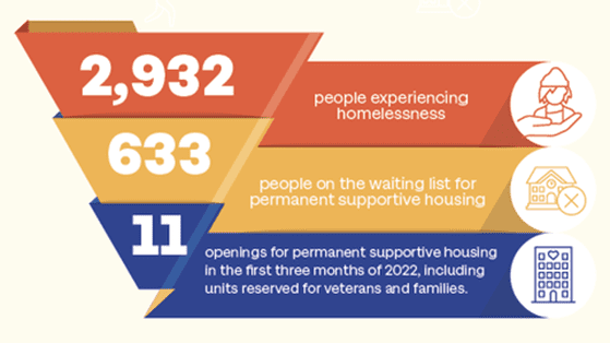 The need for housing in San Antonio is staggering: Last year, 2,932 people experienced homelessness and 633 people were on the waiting list for permanent supportive housing—yet there were only 11 openings for permanent supportive housing in the first three months of 2022.