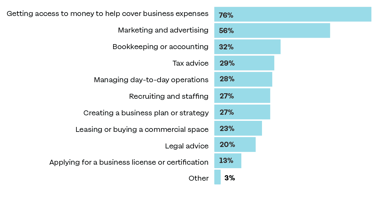 • While Black entrepreneurs are creating jobs and growing their businesses, their full power as engines of our economy remains untapped because of a lack of support. Seventy-six percent said access to capital was a challenge and of those who have never received money for their business, nearly 80% said they either could not find the right support or could not afford to pay for services that would help connect them to capital.
