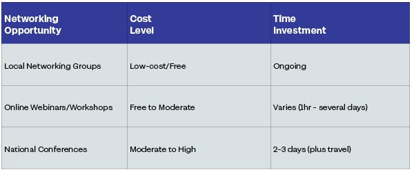 It’s important to know how much different networking opportunities will cost you in terms of money and time. Here’s a simple breakdown of various options to help you plan: